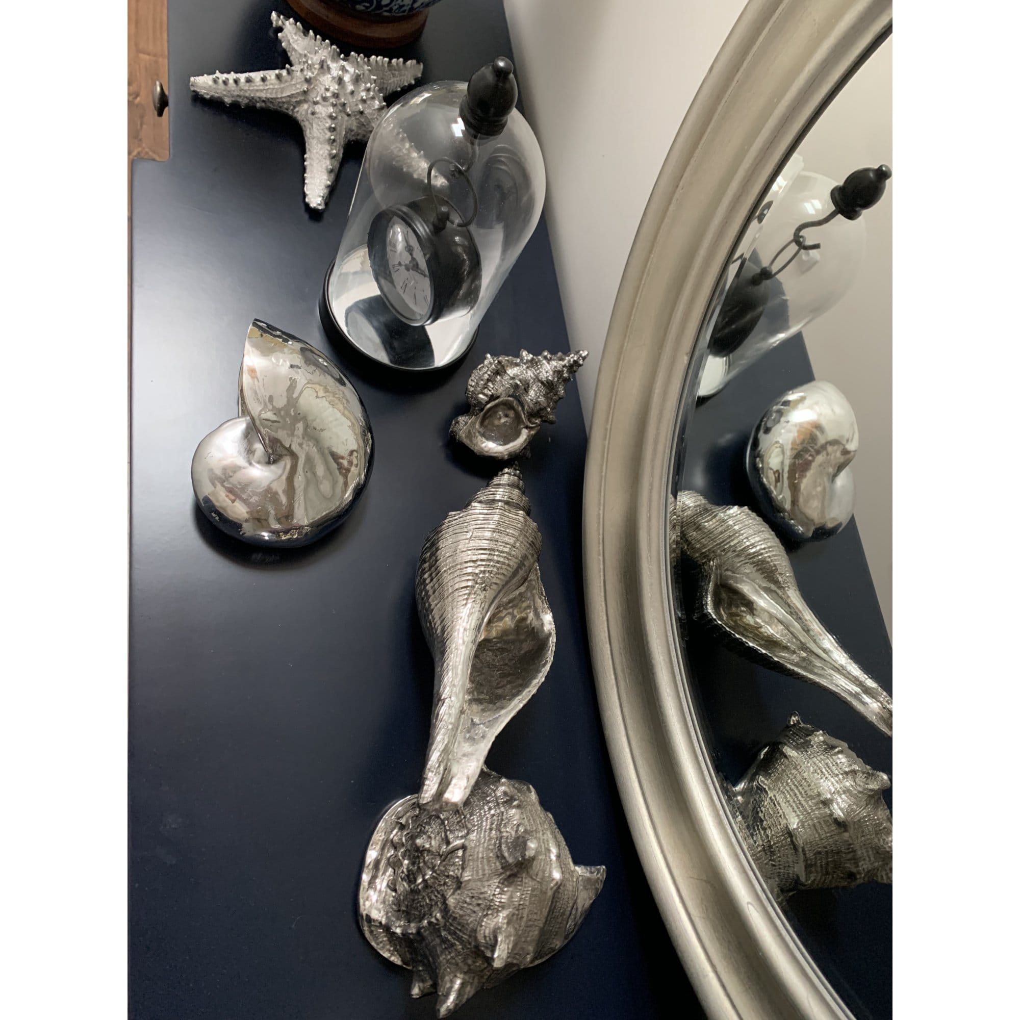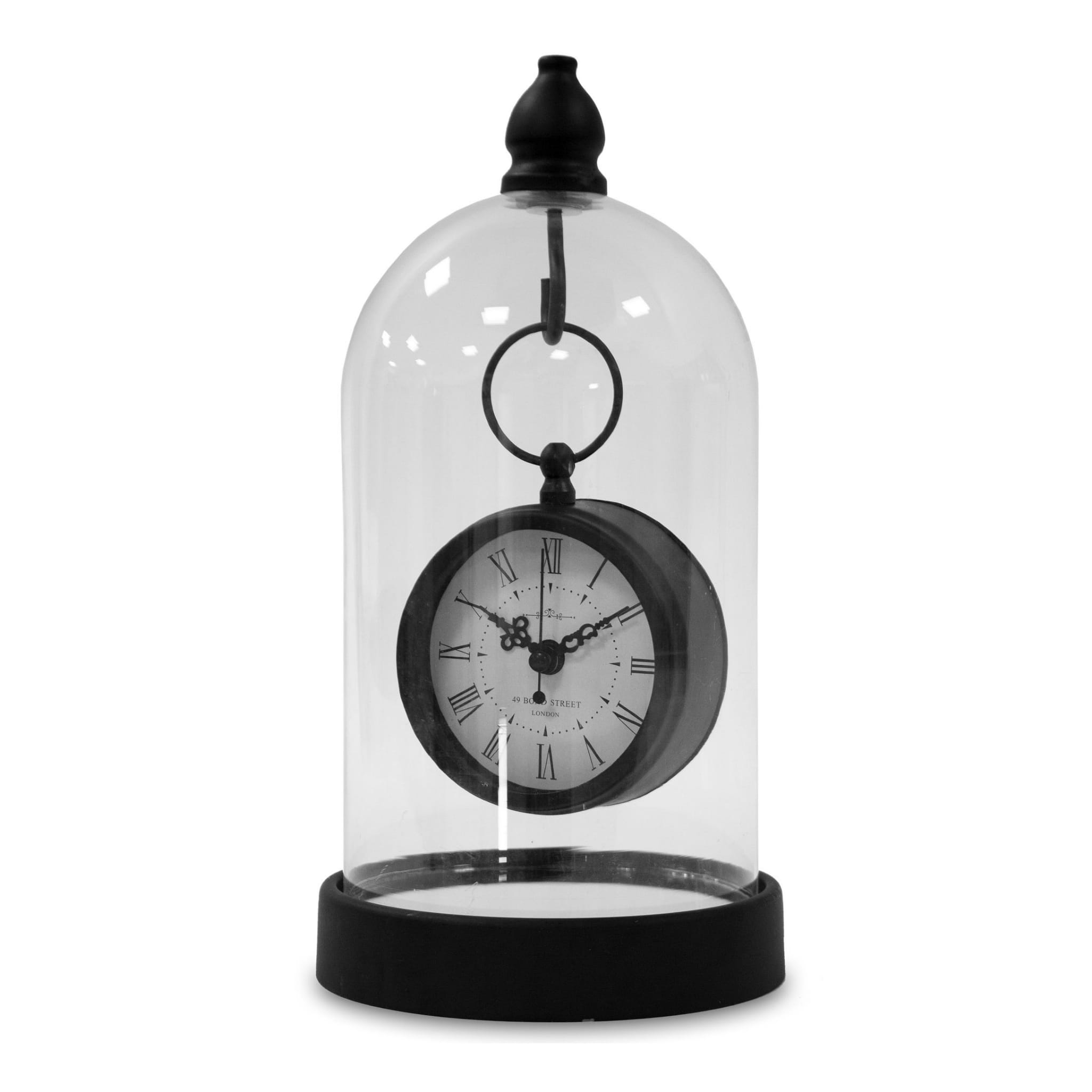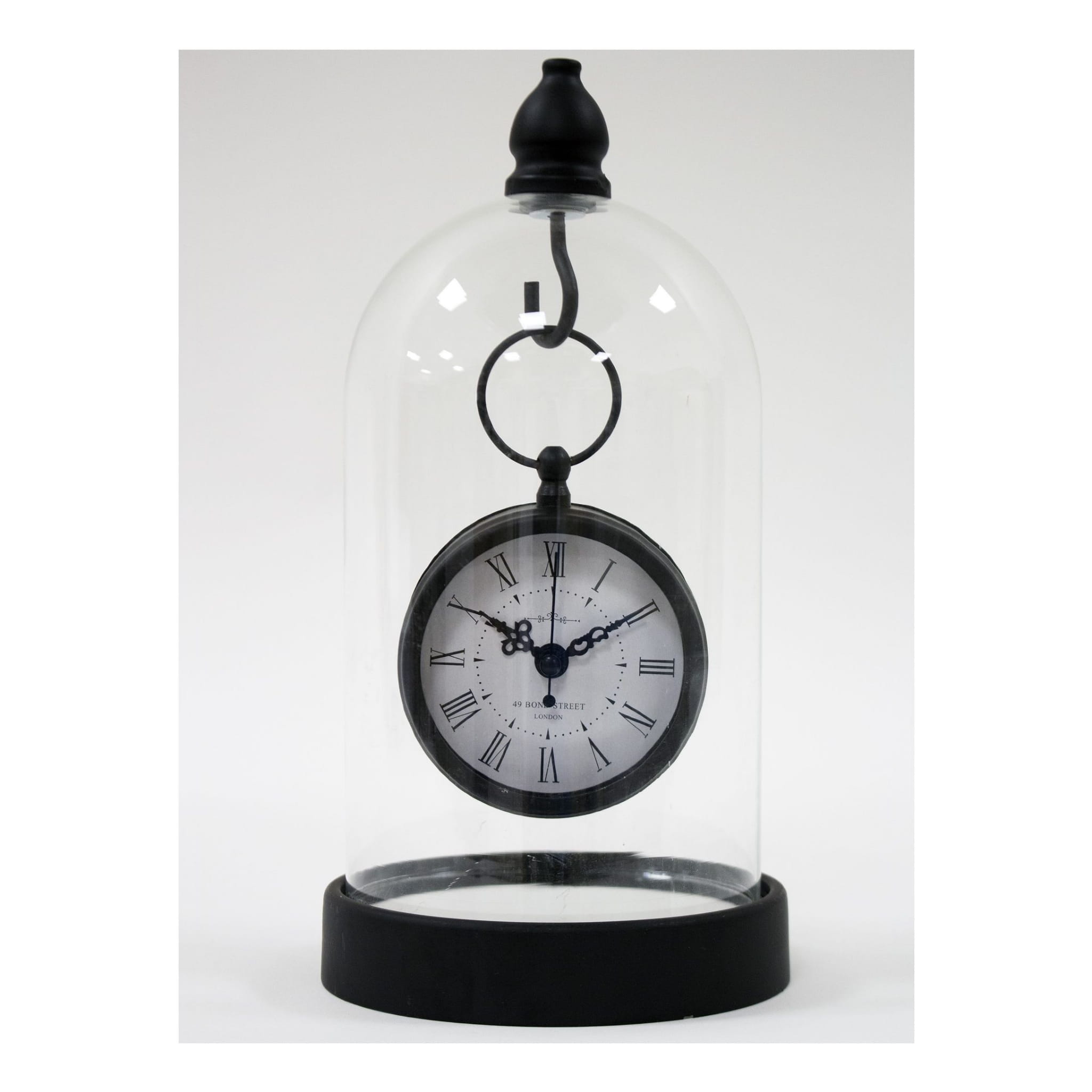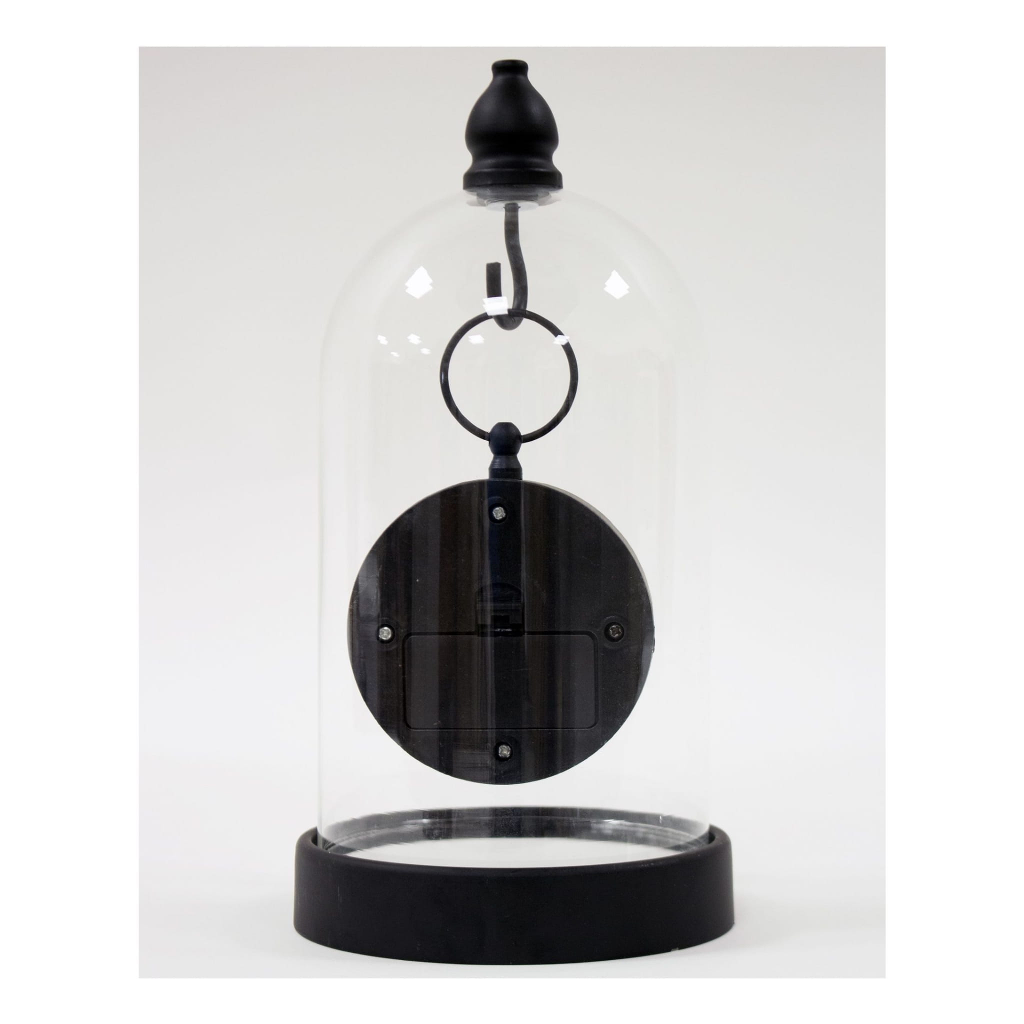 Zegar w szklanej kopule, czarny w stylu hampton pięknie będzie się komponował we wnętrzach w stylu retro, glamour oraz nowoczesnych. Zawieszony na haku pod szklana kopułą świetnie spełni funkcję dekoracyjną a zarazem praktyczną. Wyposażony w przejrzysty cyferblat, czytelne cyfry rzymskie, wskazówki do odmierzania godzin i minut, wygodne w użyciu pokrętło. Idealnie pasuje na stolik nocy lub do salon. Dobry pomysł na wyszukany prezent.