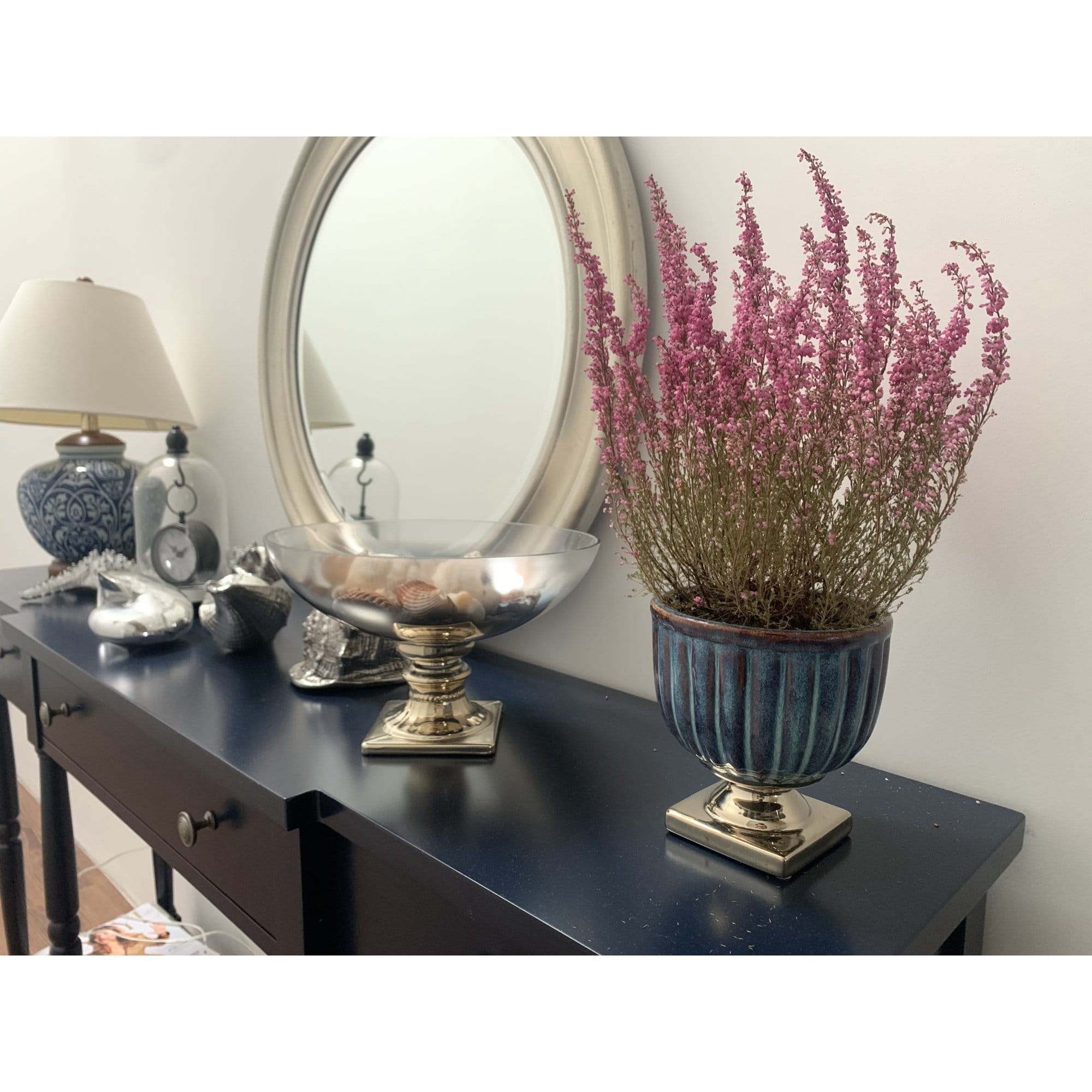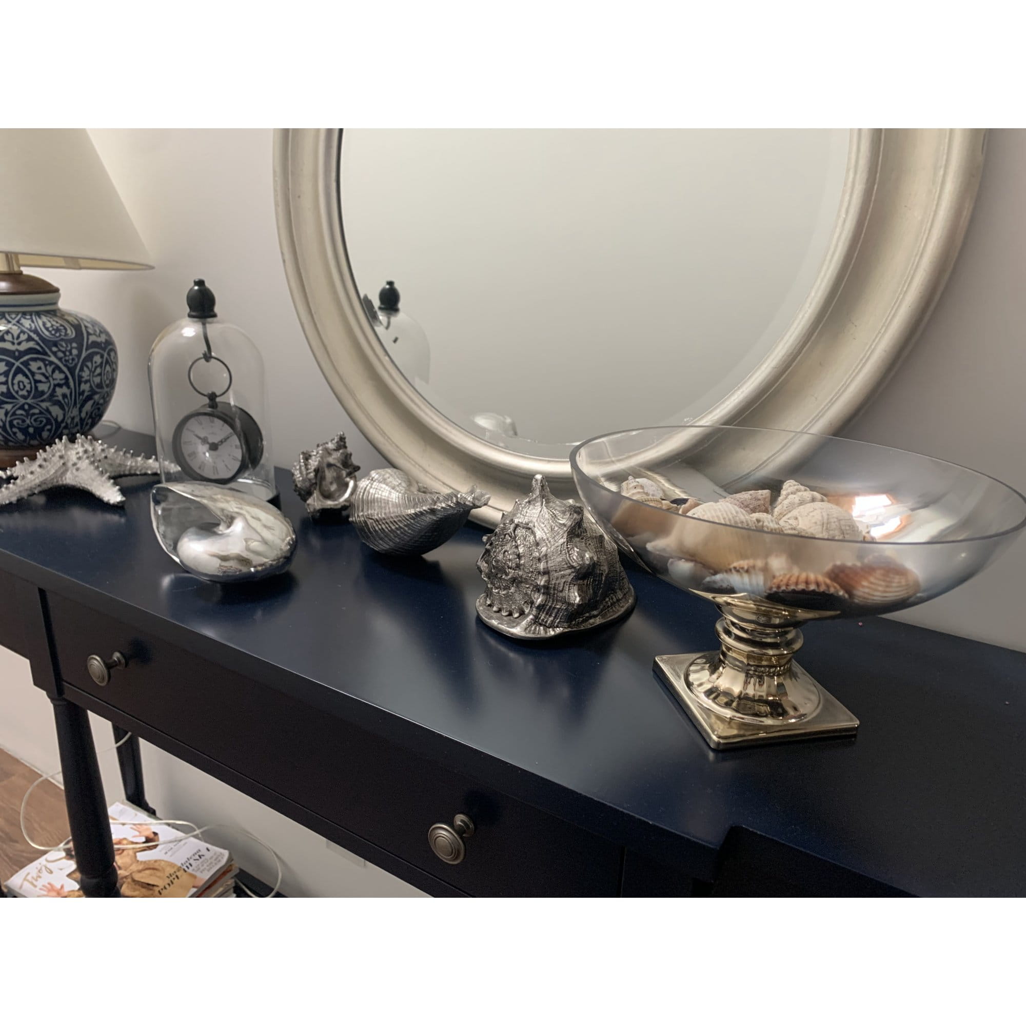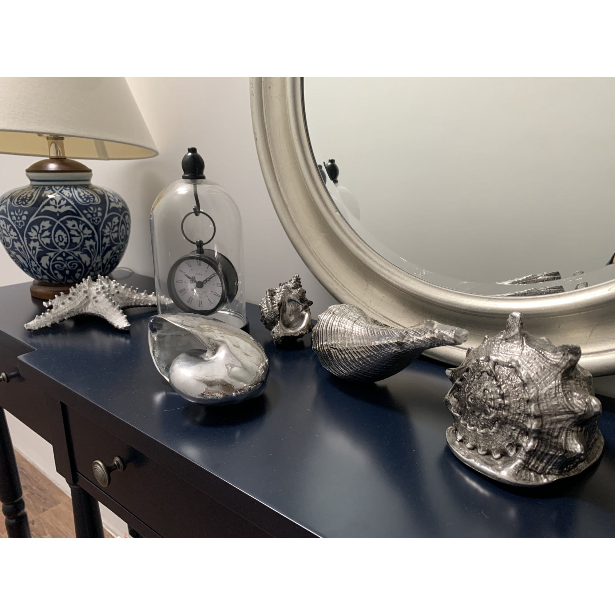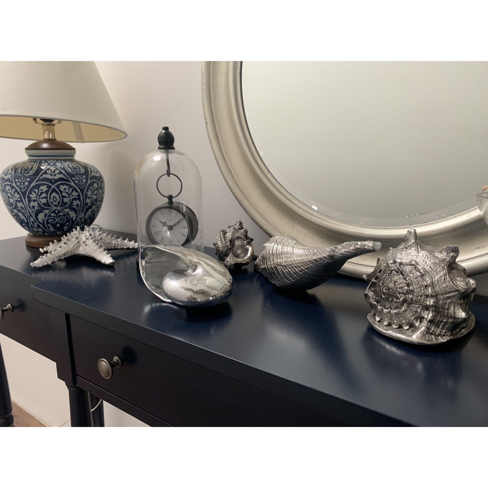 Zegar w szklanej kopule, czarny w stylu hampton pięknie będzie się komponował we wnętrzach w stylu retro, glamour oraz nowoczesnych. Zawieszony na haku pod szklana kopułą świetnie spełni funkcję dekoracyjną a zarazem praktyczną. Wyposażony w przejrzysty cyferblat, czytelne cyfry rzymskie, wskazówki do odmierzania godzin i minut, wygodne w użyciu pokrętło. Idealnie pasuje na stolik nocy lub do salon. Dobry pomysł na wyszukany prezent.